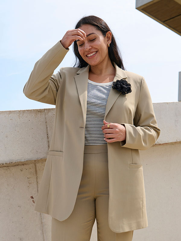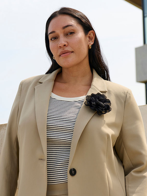 Denne elegante brun blazeren fra Kaffe Curve er det perfekte valget for enhver anledning. Med sitt tidløse snitt og behagelige passform, er den ideell for både kontoret og sosiale sammenkomster. Blazeren har en vakker, nøytral brunfarge som enkelt kan kombineres med andre farger og mønstre i garderoben din.