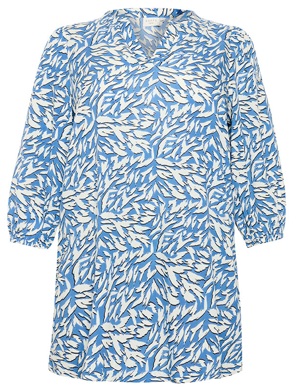 Denne sjarmerende blå tunikaen fra Kaffe Curve er det perfekte tilskuddet til enhver garderobe som verdsetter både stil og komfort. Laget av 100% Viscose (LENZING™ ECOVERO™), tilbyr den en myk følelse mot huden samtidig som den gir en flatterende passform for plus size. Det livlige bladmønsteret i nydelige blåtoner vil lyse opp din dag og legge et friskt pust til din stil.