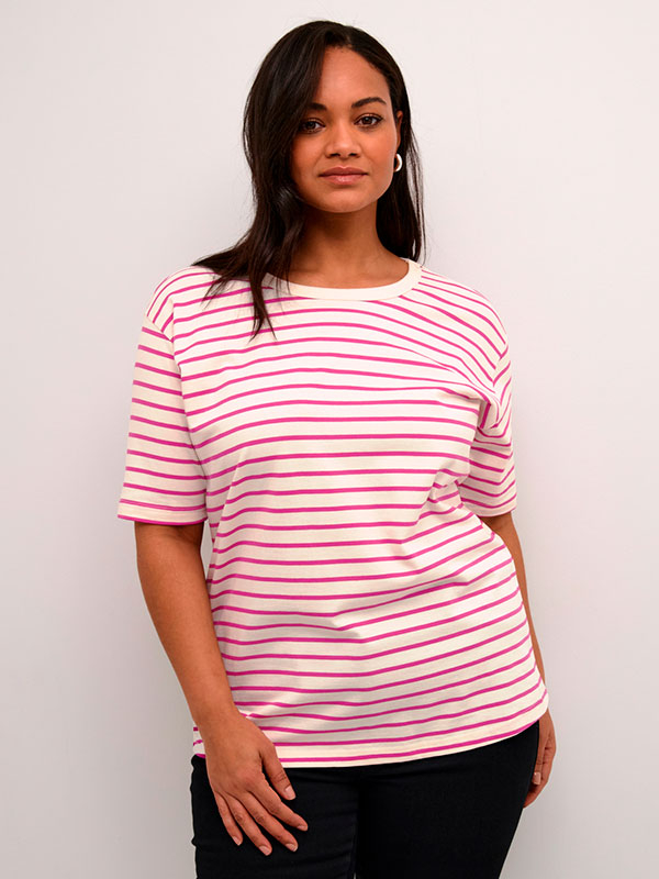 Denne råhvide T-skjorten fra Kaffe Curve er et must i enhver garderobe! Med sitt livlige rosa stripemønster tilbyr den en frisk vri på en klassisk stil. Laget av 100% bomull, garanterer den både komfort og pusteevne gjennom hele dagen, perfekt for både hverdagsbruk og spesielle anledninger.