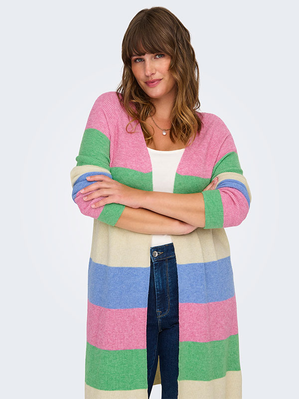 Denne flotte cardiganen fra Only Carmakoma er det perfekte tilskuddet til enhver garderobe som verdsetter både stil og komfort. Med sitt livlige fargespill i rosa, grønt, blått og krem, tilfører den et friskt pust til dine daglige antrekk. Cardiganen er designet for å være både romslig og behagelig, noe som gjør den ideell for alle med en forkjærlighet for store størrelser.