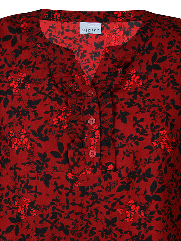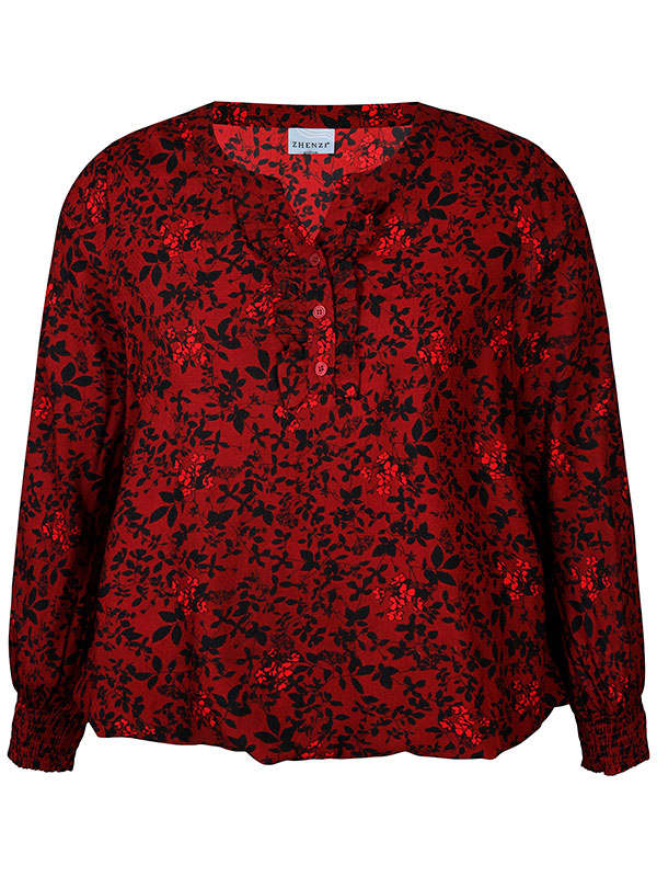 Blusen er ikke bare komfortabel, men også utrolig stilig med sitt blomstermønster i sort og rødt. Lange ermer med rynkede elastiske mansjetter legger til et moderne touch. Denne allsidige blusen kan enkelt kombineres med både jeans og skjørt i store størrelser, perfekt for både hverdags og fest. Oppdag hvordan Zhenzi forstår å kle moderne kvinner med stil og komfort.