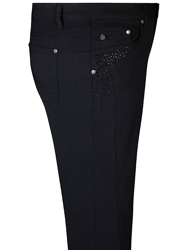 Disse buksene kommer i en klassisk sort farge og er detaljert med diskrete rhinestones som gir et subtilt, men stilig preg. Med praktiske for- og baklommer, beltehemper samt glidelås og knapper, kombinerer de funksjonalitet med mote. Sjekk ut vårt utvalg fra Zhenzi hos Curvii for flere flotte funn!