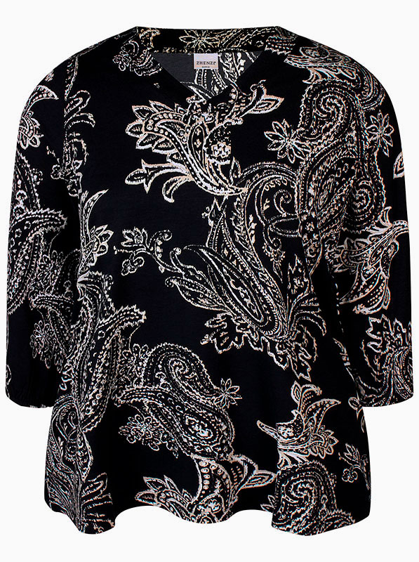 Denne T-skjorten er laget av 95% viskose og 5% elastan, noe som sikrer en myk følelse mot huden samt utmerket holdbarhet. Det sofistikerte paisleymønsteret i sort og hvitt gjør den lett å kombinere med ulike bukser og jeans i store størrelser. En stilig og behagelig tilføyelse til garderoben for den motebevisste kvinne.
