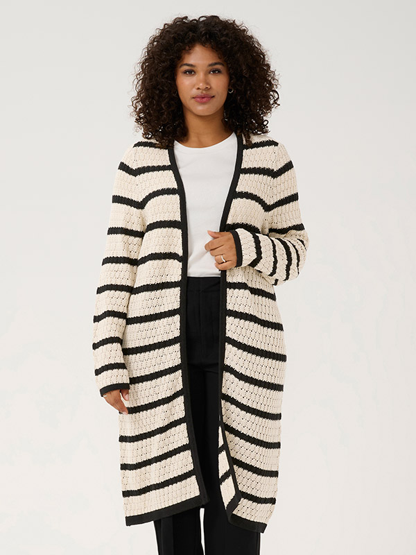 Det tidløse stripemønsteret i sort og beige gir et visuelt tiltalende uttrykk som enkelt kan matches med både jeans og kjoler. Enten det er til hverdagsbruk eller en mer formell anledning, vil denne cardiganen fra Kaffe Curve sørge for at du ser stilig ut samtidig som du føler deg komfortabel.