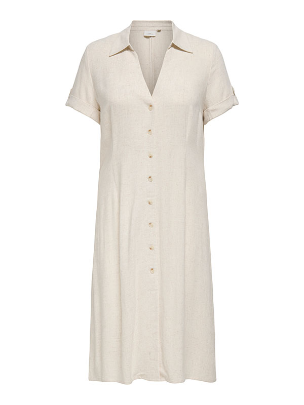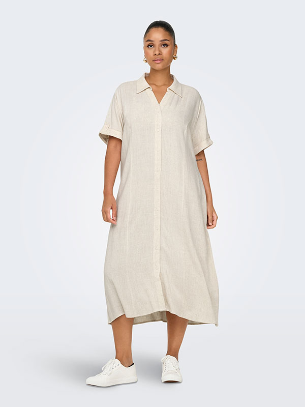 Denne elegante beige kjolen fra Only Carmakoma er det perfekte valget for enhver anledning. Laget av en herlig blanding av viskose og lin, tilbyr den både komfort og stil. Med en klassisk skjortekrage, knapper hele veien ned og korte ermer, er denne A-linjeformet kjolen flatterende for alle kroppsfasonger.