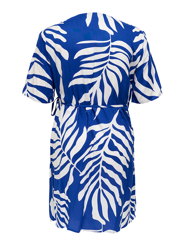 Denne sjarmerende kjolen fra Only Carmakoma er det perfekte valget for enhver anledning. Med sitt livlige blå mønster og elegante blad-design, tilbyr CARHELEN kjolen en frisk og moderne stil som passer perfekt i plus size. Kjolen er designet med en flatterende A-linjeform, ekte omslagsdesign og korte ermer, noe som gjør den både komfortabel og stilig for alle kroppstyper.