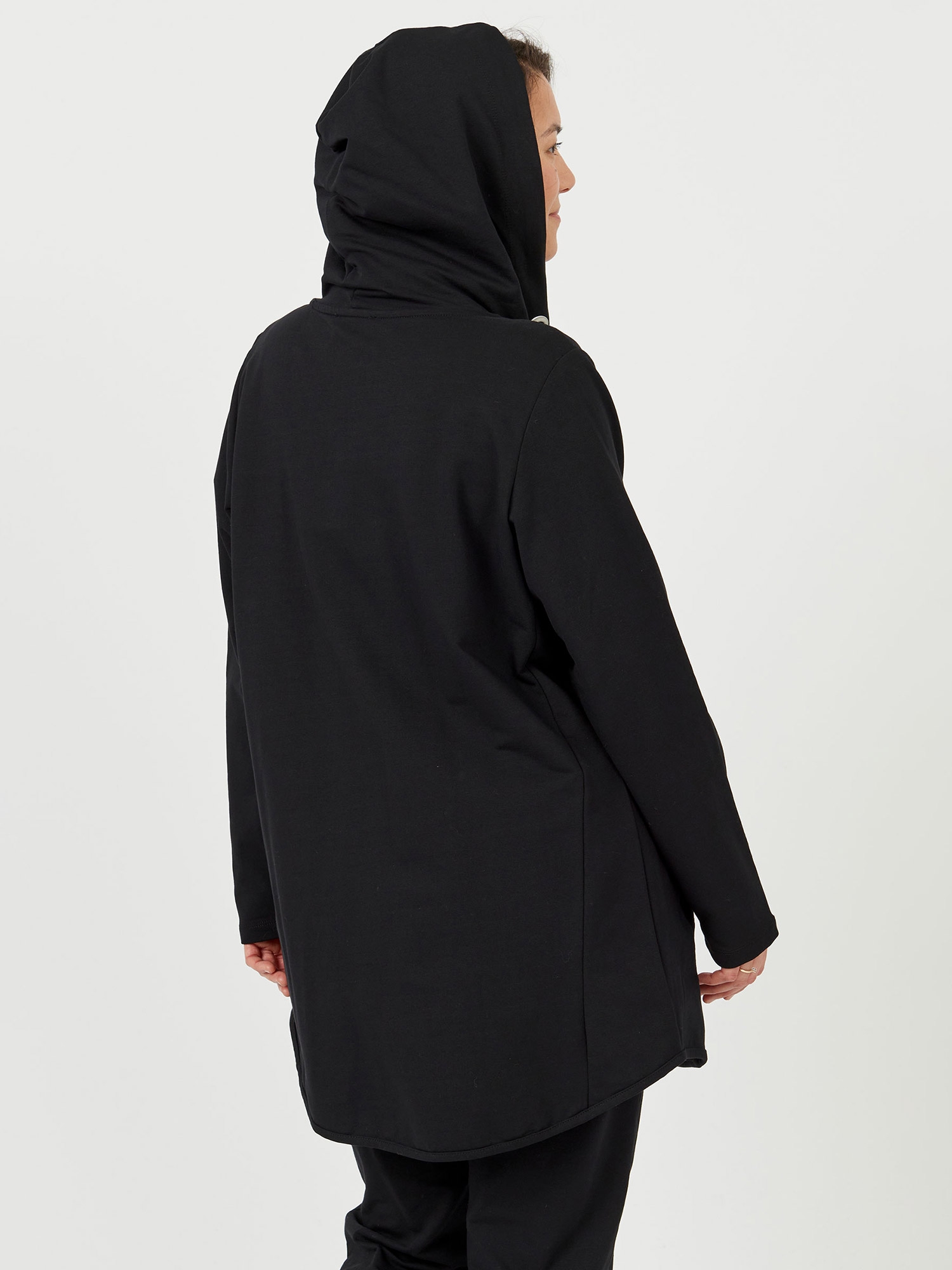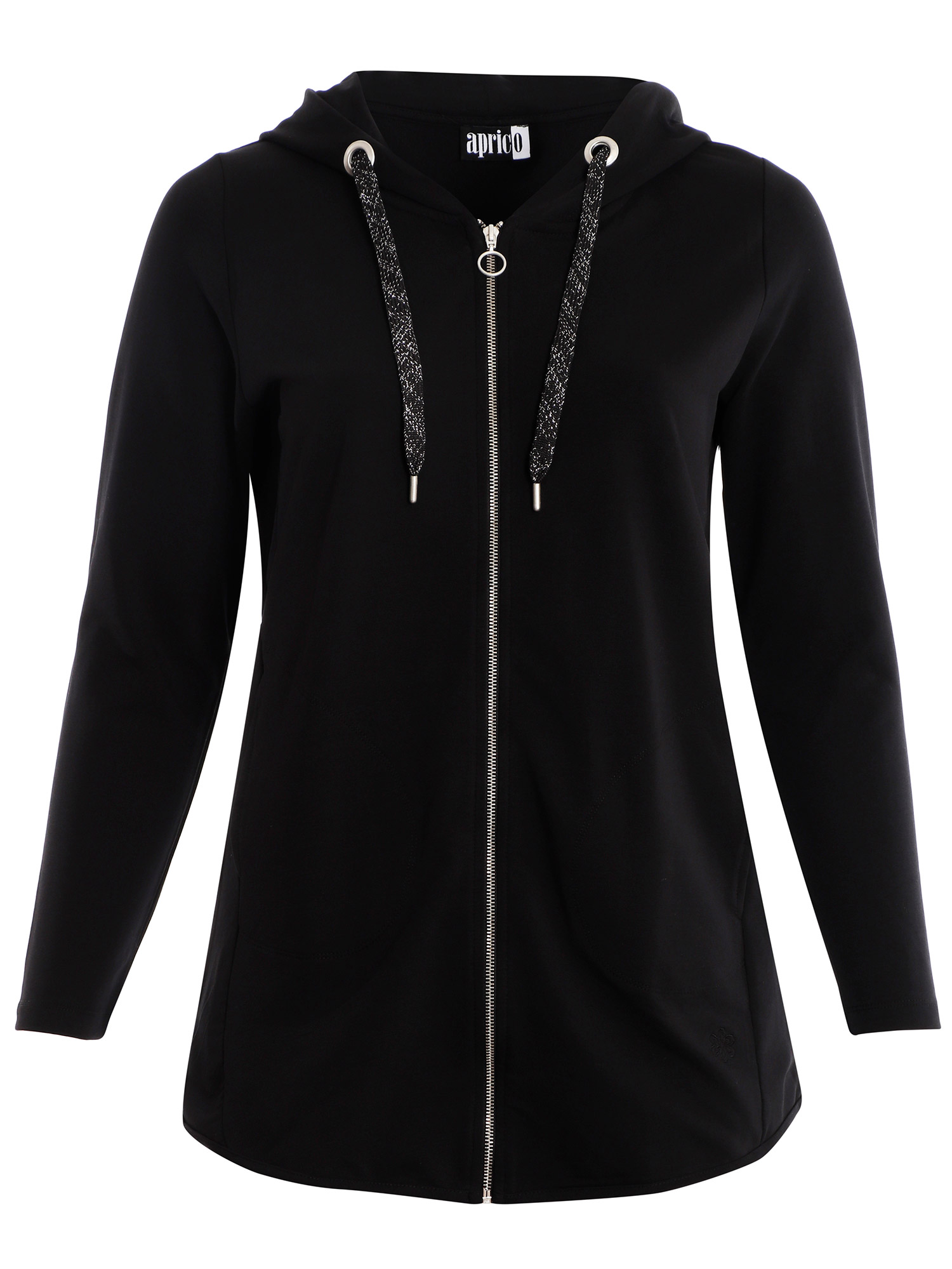 Svart cardigan med hette, glidelås og snører fra Aprico