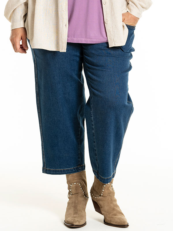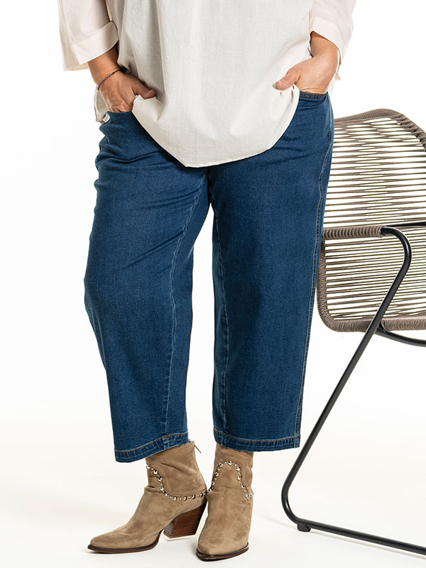 Utforsk en verden av komfort og stil med Irene Jeans i store størrelser fra Gozzip. Disse jeansene er laget med en høy andel bomull og viskose, tilsatt et snev av elastan for den perfekte passformen. Med sitt brede ben og 7/8 lengde, tilbyr de en flatterende silhuett for alle kroppsformer. Den vakre blåfargen komplementerer enhver topp eller tilbehør, og gjør dem til et must i enhver garderobe.