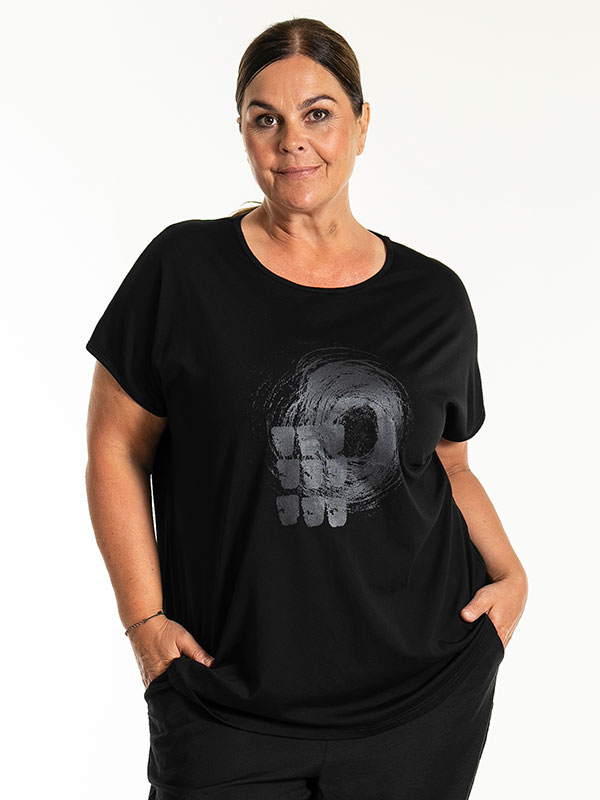 Utforsk hverdagsluksus med denne elegante T-shirten i store størrelser fra Gozzip Black. T-skjorten 'Hensia' i sort farge er perfekt for den som ønsker både stil og komfort. Med en avslappet passform, rund hals og korte ermer, tilbyr denne toppen en flatterende silhuett for alle kroppsfasonger. Det unike trykket foran tilfører et moderne preg, mens den avrundede kanten gir en myk finish.