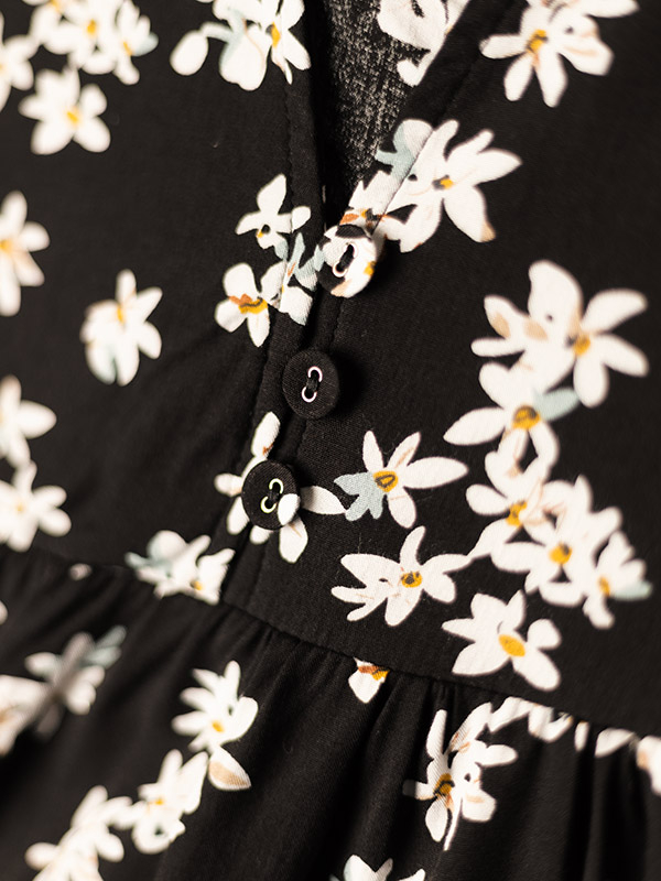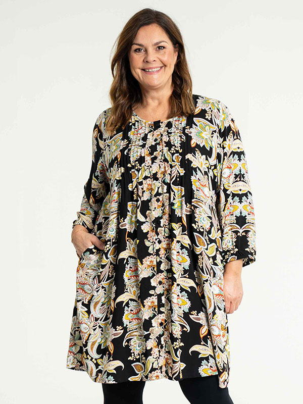 Varme jordfarger, levende mønstre og en kjærlig touch av den ville naturen. Her kan du med fordel mikse med en ensfarget underdel i svart eller en av de fine fargene fra mønsteret.