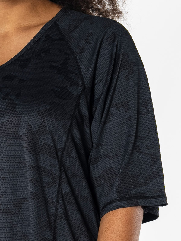 Denne grå træningsblusen fra Studio er perfekt for kvinner som ønsker komfort og stil under treningen. Med sitt lette stoff og løstsittende A-linjeform, tilbyr den utmerket bevegelsesfrihet og er ideell for alle typer fysisk aktivitet. V-halsen og de korte ermene tilfører et feminint preg, mens det unike mønsteret gir et moderne og subtilt utseende.