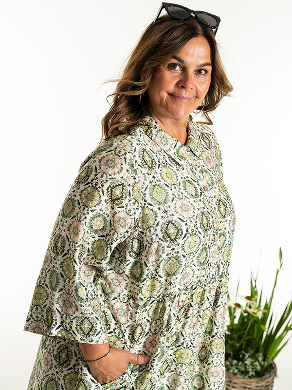 La deg forføre av den vakre Ann-Louise kjolen fra Gozzip, perfekt for enhver anledning. Denne kjolen i en frisk grønn farge og med et iøynefallende mønster er laget av en behagelig viskoseblanding, sikrer en løs passform som flatterer figuren. Med klassisk skjortekrage, 3/4 ermer og praktiske sidelommer, kombinerer den stil med funksjonalitet.