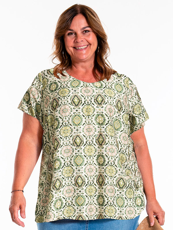 Denne grønne T-skjorten fra Gozzip er perfekt for deg som ønsker både stil og komfort. T-skjorten har et vakkert mønster som kombinerer pastellgrønne og nøytrale toner, noe som gjør den lett å matche med andre store størrelser jeans. Med en avslappet passform og avrundet hem, tilbyr denne toppen en flatterende silhuett for alle kroppsformer.