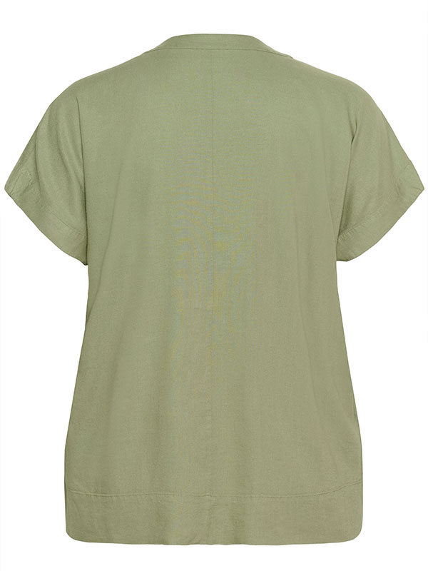 Denne sjarmerende grønne blusen fra Kaffe Curve er det perfekte tilskuddet til garderoben din denne sesongen. Laget av en behagelig blanding av 70% Viscose (LivaEcoT) og 30% lin, tilbyr den både komfort og stil. Med en løs passform, V-hals og korte ermer, er denne blusen ideell for både hverdagslige og mer formelle anledninger.