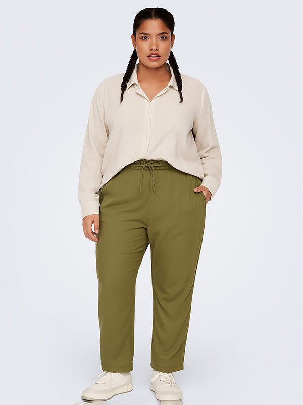 Utforsk komforten med disse stilige grønne buksene fra Only Carmakoma, perfekt for enhver anledning. Laget av en behagelig blanding av viskose og lin, tilbyr disse buksene både pusteevne og holdbarhet uten å strekke seg. Med rette ben og en praktisk snøring i livet, kombinerer de funksjonalitet med en flatterende passform for pluss størrelser.