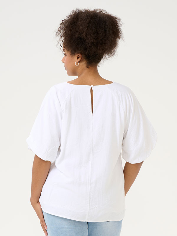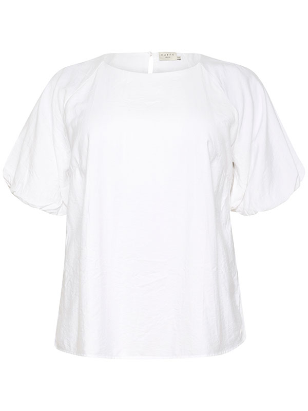 Denne vakre blusen i hvid fra Kaffe Curve er det perfekte valget for en stilfull og komfortabel hverdag. Med sin løse passform og A-linjeform, gir KCgabbi blusen en flatterende silhuett for alle kroppstyper. Blusen er laget av en behagelig viskoseblanding, og har korte, puffede ermer med elastikk som tilfører et moderne preg til det klassiske designet. Den runde halsen og nøkkelhullsåpningen på ryggen gir en subtil, men sjarmerende detalj.