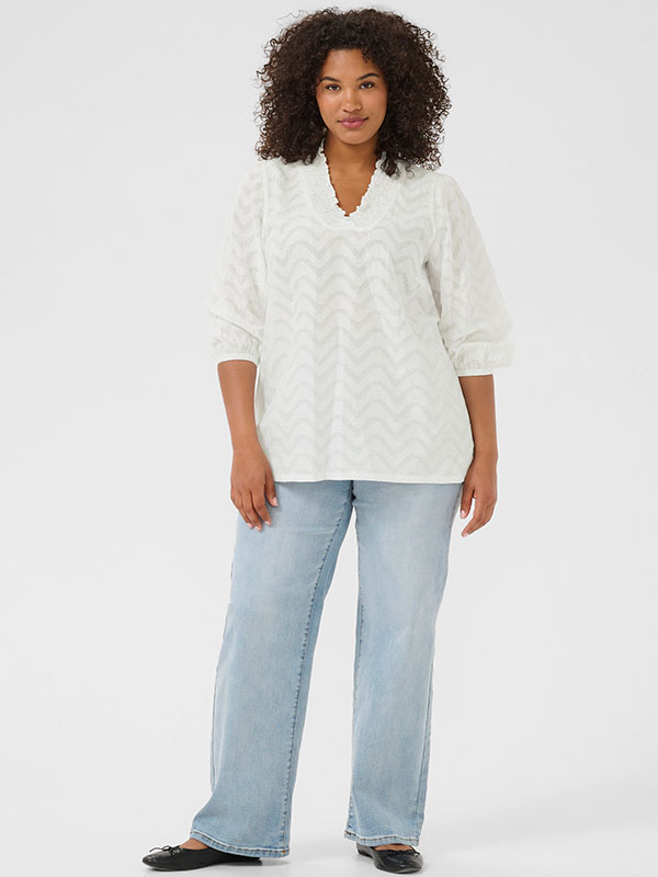 La deg forføre av den tidløse sjarmen til Kaffe Curve med vår nyeste tilvekst, KCvitana blusen. Dette er et must-have for enhver garderobe, spesielt designet for plus size. Blusen er laget av 100% bomull, som sikrer en behagelig og pustende følelse hele dagen. Den hvite fargen komplementeres vakkert av et diskret, bølgete mønster som tilfører et snev av raffinement og stil.