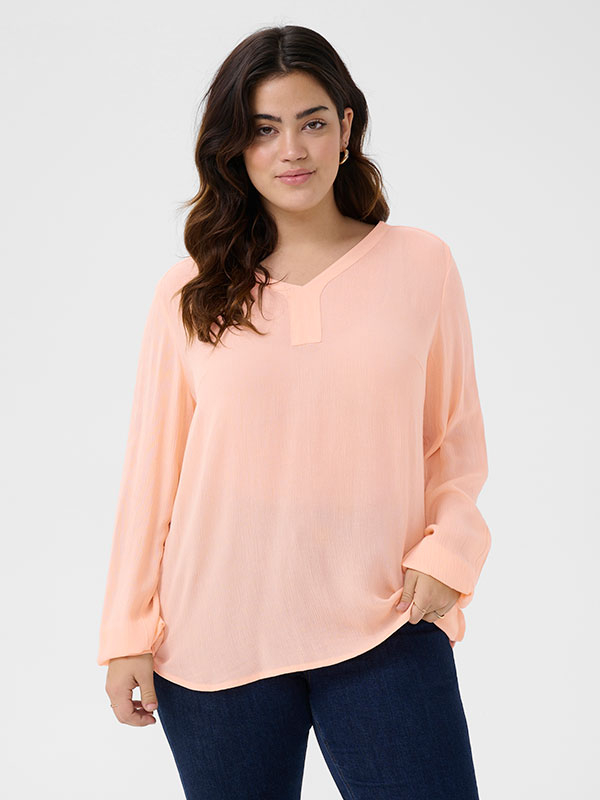 Denne elegante blusen fra Kaffe Curve er perfekt for enhver anledning. Med sin vakre koralfarge og delikate tekstur i 100% Viscose (LENZING™ ECOVERO™), tilbyr den både komfort og stil. Blusen har en løs passform som smigrende faller rundt kroppen, og er ideell for de som foretrekker klær som både ser bra ut og føles behagelige.