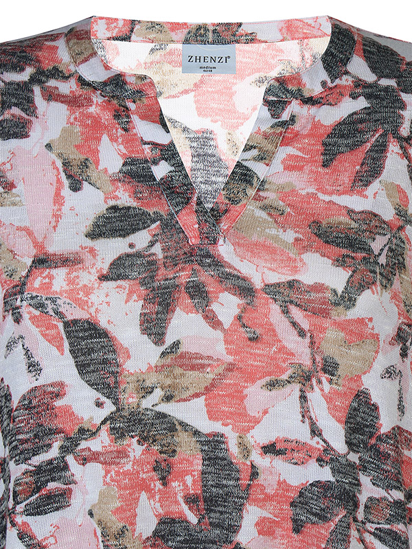 Denne sjarmerende tunikaen i koral med et lekent bladmønster er perfekt for enhver anledning. Zh-Faya tunikaen fra Zhenzi er designet for å gi en flatterende A-linjeform som passer behagelig over kroppen. Med korte ermer og en avrundet hem, gir denne tunikaen en avslappet, men stilig look.