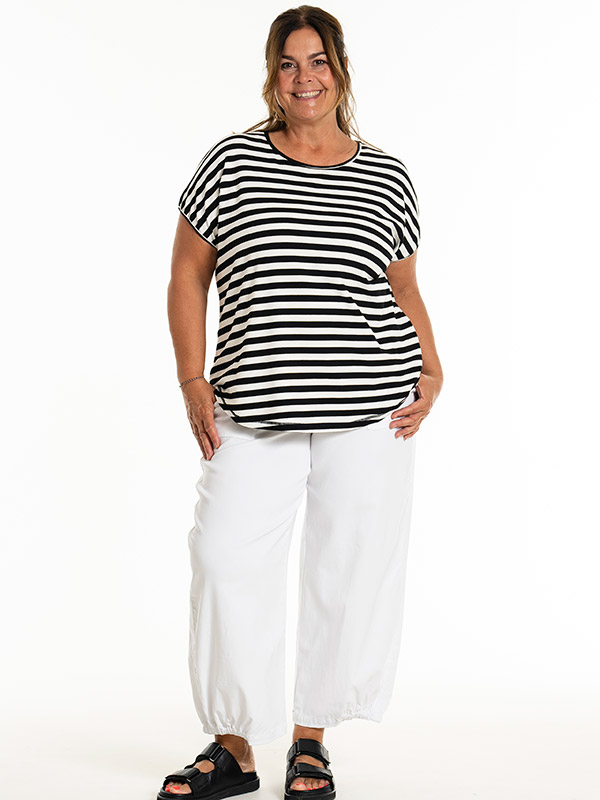 Denne elegante sorte T-shirten fra Gozzip er perfekt for enhver anledning. Med sitt løse snitt og A-form, tilbyr den en flatterende passform for plus size. T-shirten har ekstra lengde bak og en avrundet kant som skaper en myk og feminin silhuett, mens det tidløse stripemønsteret legger til et moderne preg.
