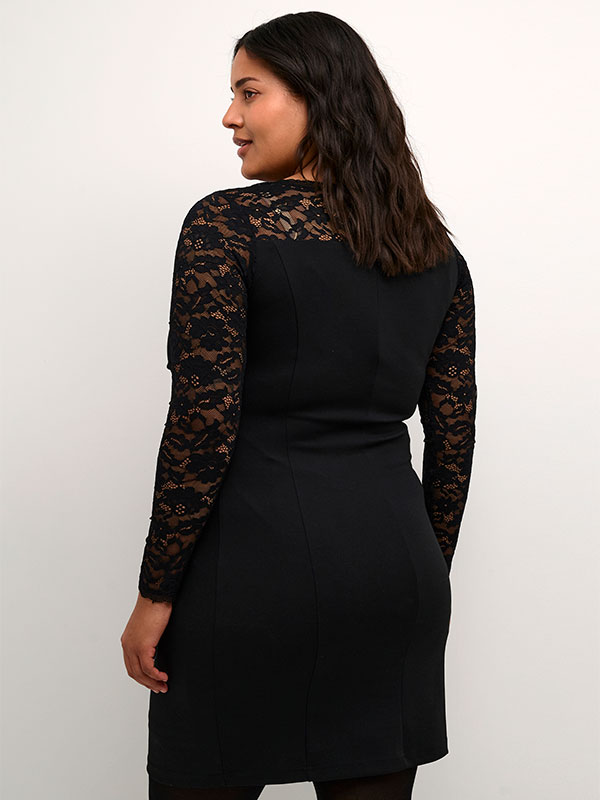 Denne elegante sorte kjolen fra Kaffe Curve er perfekt for enhver anledning. Med sitt lett tilpassede snitt og stretchy stoff, tilbyr den en flatterende passform for større størrelser. Lange ermer og en dyp V-hals er detaljert med delikat blondestoff, som tilfører et touch av femininitet og sofistikasjon til designet.
