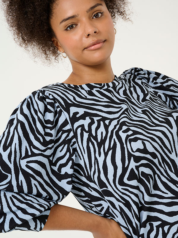 Denne sjarmerende blusen fra Kaffe Curve er det perfekte tilskuddet til enhver garderobe. Med sitt iøynefallende blå og hvite sebramønster, tilbyr KCivena blusen en frisk og moderne stil som fanger oppmerksomheten. Den runde halsen og 3/4 ermene med puff gir et flatterende snitt, mens det stretchable stoffet sikrer en behagelig passform for alle kroppstyper.