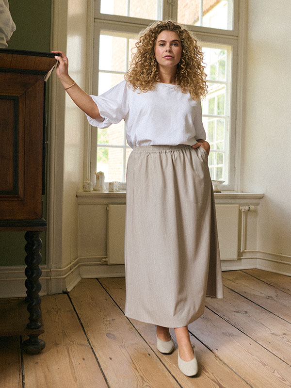 Utforsk en verden av komfort og stil med denne elegante nederdelen i sandfarge fra Kaffe Curve, perfekt tilpasset for større størrelser. Med en praktisk elastisk midje og avrundet kant, tilbyr denne nederdelen både bevegelsesfrihet og en flatterende silhuett. De diskrete frontlommene tilfører både funksjonalitet og en touch av stil.