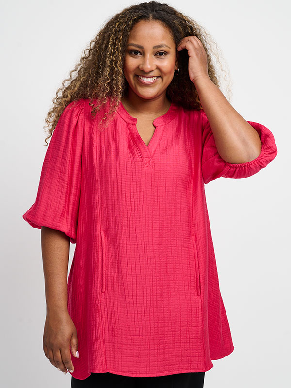 Denne sjarmerende rosa blusen fra Pont Neuf er et must i enhver garderobe. Med en behagelig løs passform og elegante detaljer som puffærmer og elastikk ved ermene, tilbyr denne blusen både stil og komfort. Den unike Y-halsen og ryggfolden legger til et moderne preg, mens de praktiske sidelommene gir ekstra funksjonalitet.