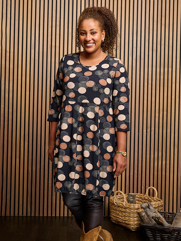 Kjolens sorte farge er elegant kombinert med et iøynefallende mønster i nøytrale toner, noe som gjør den lett å style med dine favorittaccessoirer. Enten du skal på kontoret eller en festlig sammenkomst, vil denne kjolen fra vår plus size kjolekolleksjon sørge for at du ser fantastisk ut og føler deg komfortabel gjennom hele dagen. Oppdag mer fra vårt brede utvalg av festklær i store størrelser og finn din nye favoritt!