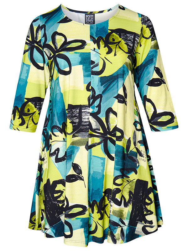 Denne nydelige kjolen i store størrelser fra Pont Neuf er et must i enhver garderobe som verdsetter både stil og komfort. Satina Tea kjolen er fremstilt av en herlig blanding av viskose og elastan, noe som sikrer en behagelig passform og god bevegelsesfrihet. Med sitt livlige mønster i grønne og blå toner og elegante A-linjeform, er denne kjolen perfekt for både hverdags og spesielle anledninger.