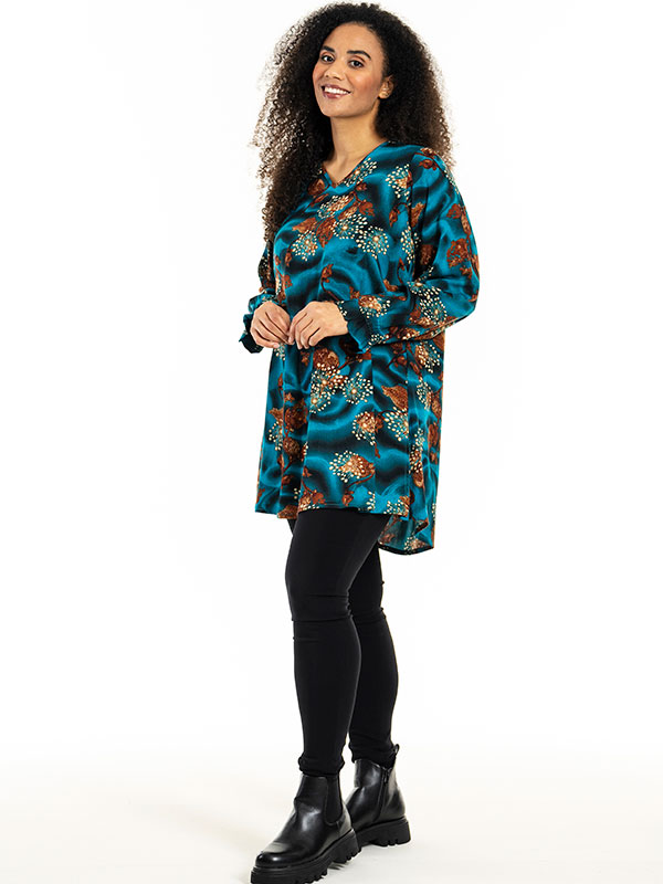 Denne elegante tunikaen fra Studio er perfekt for enhver anledning. Med sitt livlige mønster og vakre petroleumfarge, tilbyr den en flatterende A-linjeform og en avrundet kant som skaper en myk, feminin silhuett. Lange ermer med elastikk og en behagelig V-hals gir både komfort og stil.