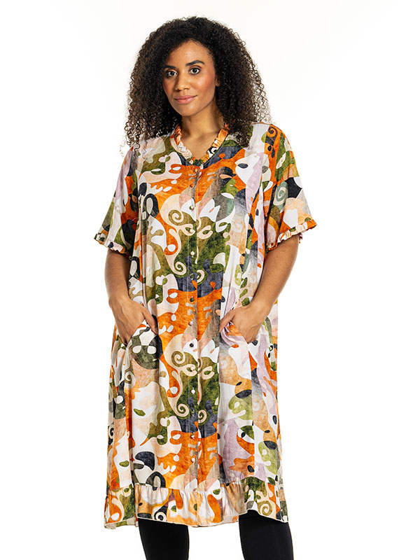 Sally kjolen er detaljrik med knapper hele veien ned, rysjedetaljer og praktiske sidelommer for en blanding av stil og funksjonalitet. Den dype V-halsen fremhever figuren på en flatterende måte, mens det luftige stoffet gjør denne kjolen ideell for varmere dager. Perfekt for de som søker store størrelser kjoler som kombinerer komfort og stil. La Sally kjolen bli en fargerik tilføyelse til din garderobe!