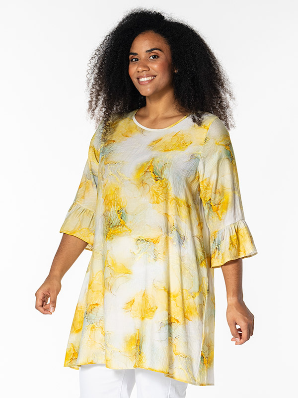 Denne sjarmerende tunikaen i store størrelser fra Studio er det perfekte tilskuddet til garderoben din denne sesongen. Med sin livlige gule farge og delikate mønster, tilbyr den en frisk og tiltalende look. Tunikaen har en behagelig A-linjeform, rund hals og 3/4 ermer med volanger, noe som gir et lett og luftig uttrykk.