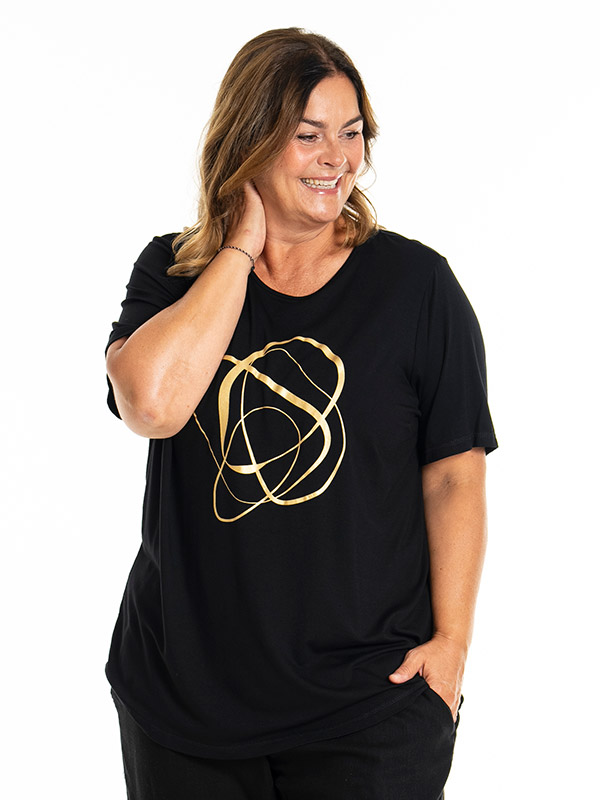 Denne elegante, sorte T-skjorten fra Gozzip er det perfekte valget for deg som søker komfort kombinert med stil. T-skjorten er laget av myk viskosejersey og designet med en løs passform som faller flatterende over kroppen. Det unike, gullfargede mønsteret tilfører et moderne preg som gjør at du skiller deg ut i mengden.