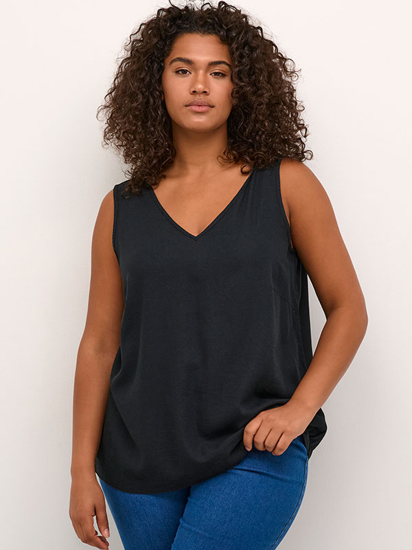 Denne elegante sorte toppen fra Kaffe Curve er det perfekte valget for de som søker både stil og komfort. Laget med en blanding av 70% Viscose (LivaEcoT) og 30% lin, tilbyr den en luftig og behagelig passform som er ideell for enhver anledning. Med sin flatterende A-linjeform og avrundede kant, fremhever den figuren på en subtil måte, mens V-halsen legger til et moderne preg.
