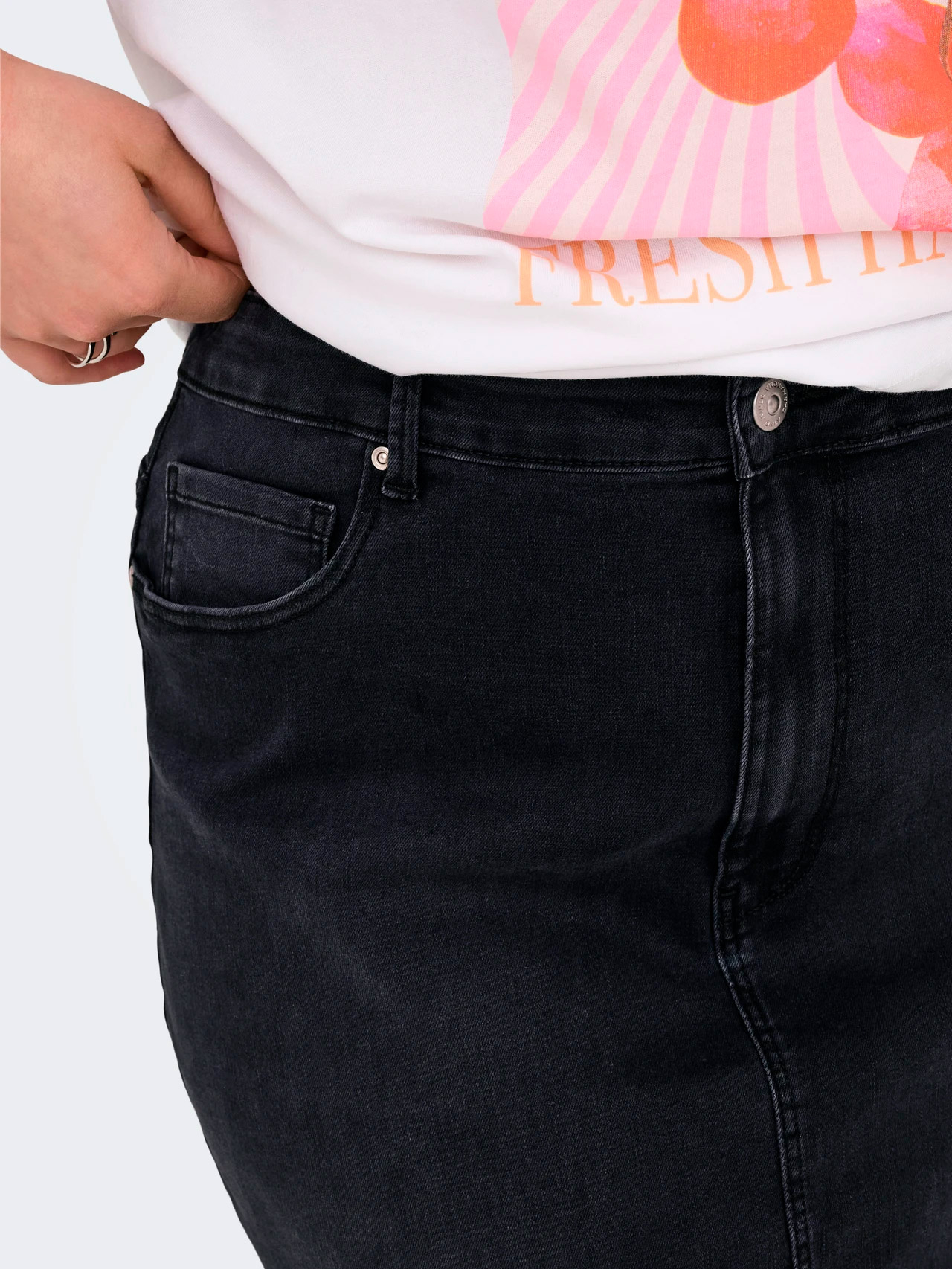 Utforsk en ny tilnærming til hverdagsmoten med denne elegante sorte nederdelen fra Only Carmakoma. Designet spesielt for store størrelser, kombinerer denne nederdelen komfort og stil med sine praktiske front- og baklommer, beltehemper, og en smart glidelås med knapper. Den lett tilpassede passformen fremhever figuren på en flatterende måte, mens bomullsblandingen med stretch sikrer at du kan bevege deg fritt og komfortabelt gjennom dagen.