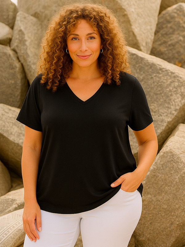 Denne elegante T-skjorten fra Zhenzi er perfekt for enhver anledning. Med sin rene sorte farge og klassiske design, tilbyr Alberta T-skjorten en flatterende V-hals og korte ermer som kombinerer komfort med en touch av sofistikasjon. Laget av 100% bomull, gir denne T-skjorten en myk følelse mot huden og en behagelig passform for større størrelser.