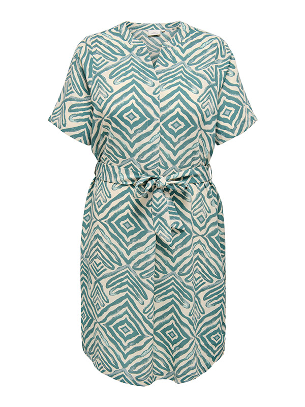 Denne sjarmerende kjolen fra Only Carmakoma er perfekt for enhver anledning. Med sitt livlige mønster og friske turkise farge, tilfører den et pust av friskhet til din garderobe. Kjolen er laget av 100% Viscose Livaeco by Birla Cellulose™, som sikrer en myk og behagelig følelse mot huden. Med korte ermer, en elegant Y-hals og praktiske sideåpninger, kombinerer den stil med komfort.